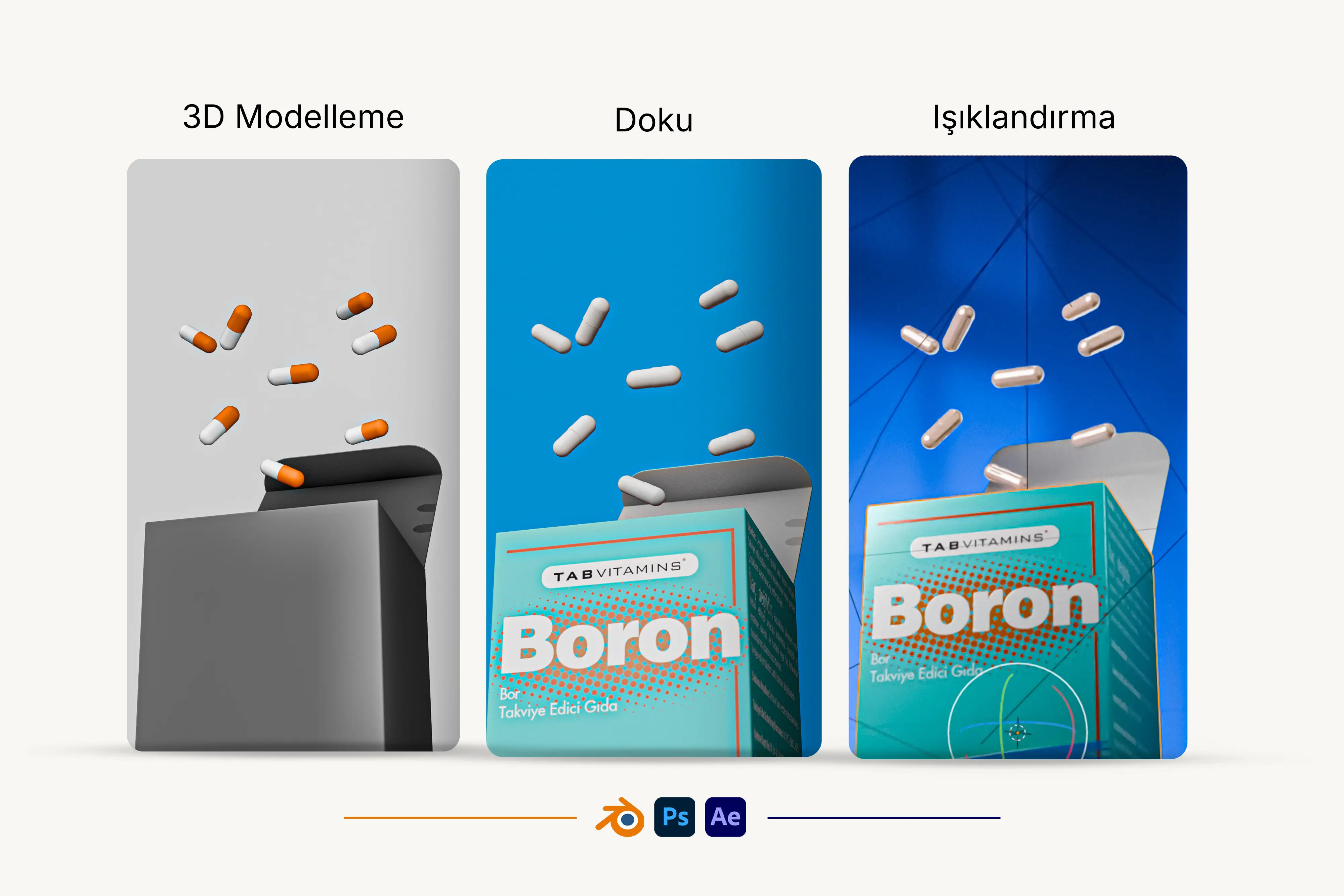 Tabvitamins Boron için oluşturduğumuz projede, ürünün temiz ve güven veren yapısını minimal bir ışık atmosferiyle vurguladık. Statik duruştan dinamik harekete uzanan bu geçiş, ürünün enerjisini ve bütünlüğünü sade bir ritimle görünür kıldı.