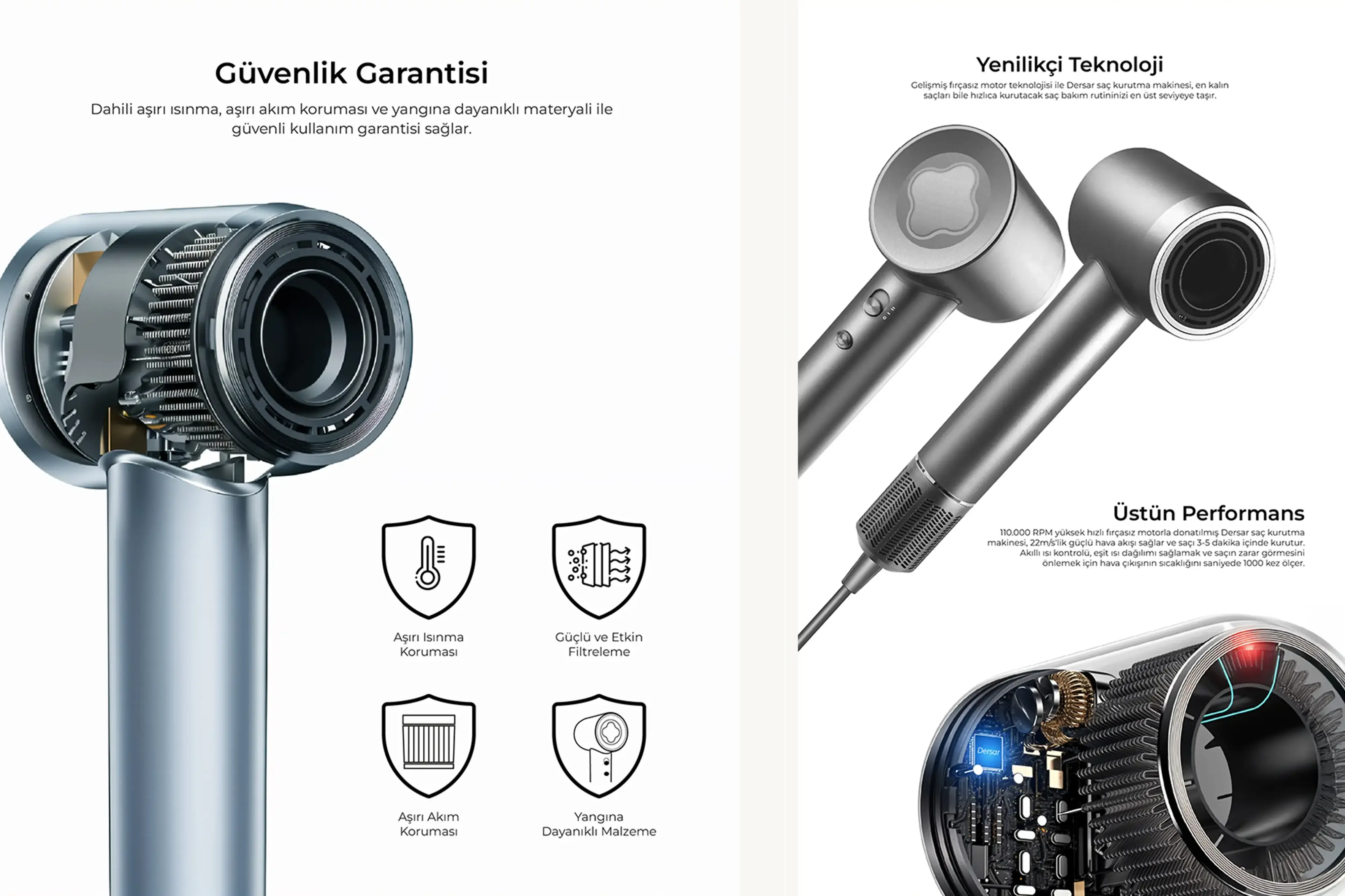 Dersar için hazırladığımız çalışmada, ürünün yüksek teknoloji ve modern tasarımını estetik bir görsel dile dönüştürdük. Fotoğraf çekimleri, manipülasyonlar, grafik tasarımlar ve branding unsurlarıyla ürünün sadece bir saç kurutma makinesi değil, yaşam tarzını yansıtan bir ürün olarak konumlanmasını hedefledik.